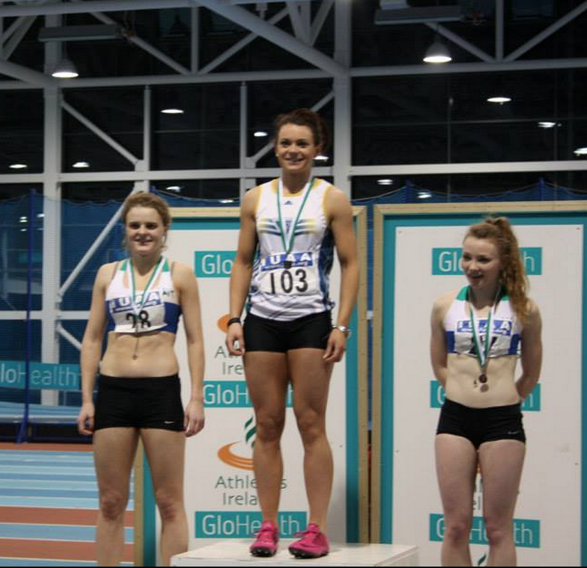 First up we had Catherine McManus who battled hard in the women’s 60m hurdles and came 2nd with a new PB of 8.44 seconds which was a DCU record and moved her to joint 4th place on the Irish All Time List. With little time to recover, Catherine then went on to place 3rd in the women’s 60m against a top class field in the Championships and ran a SB of 7.54 seconds.