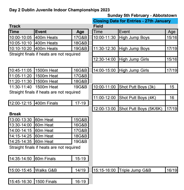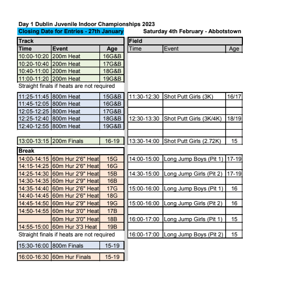 Please note that there were a number of dates/times incorrectly listed on the online entry system for a few events.U10 and U11 boys 60m is incorrectly listed for the 5th of February. These events take place on the 12th.