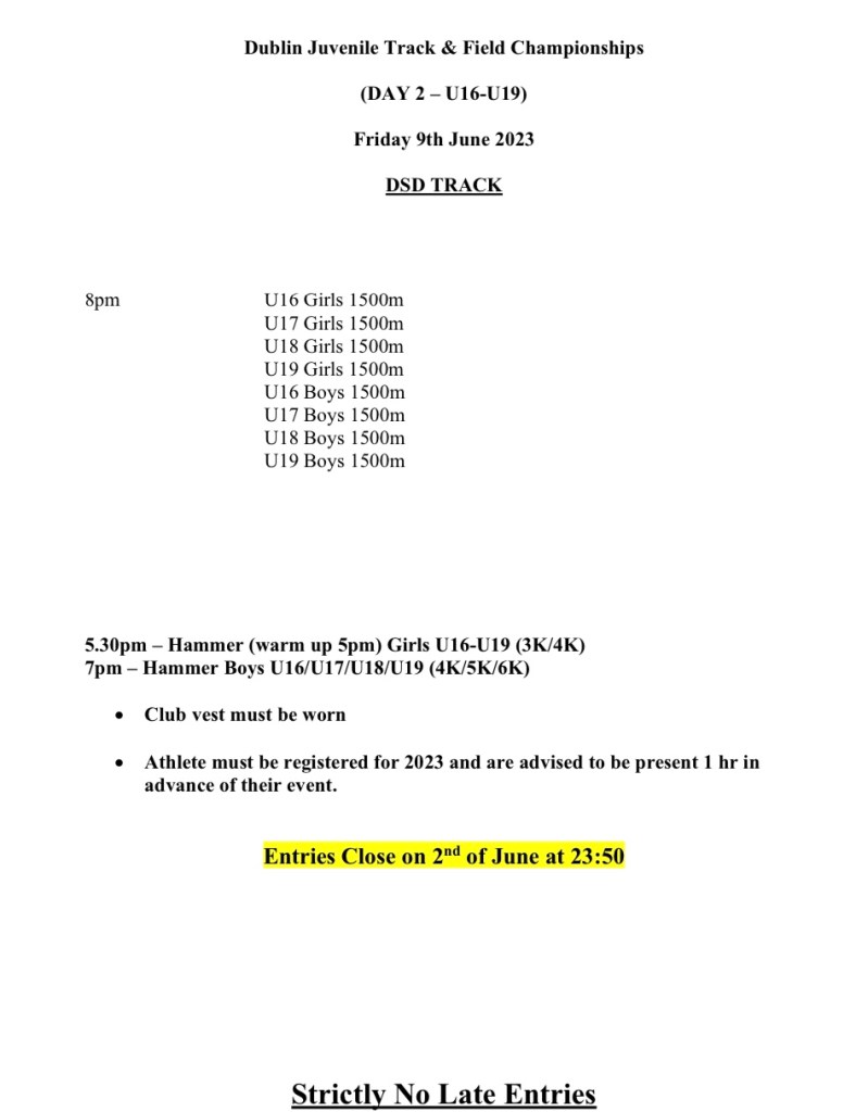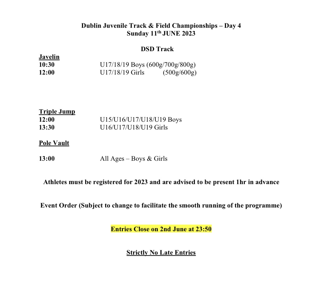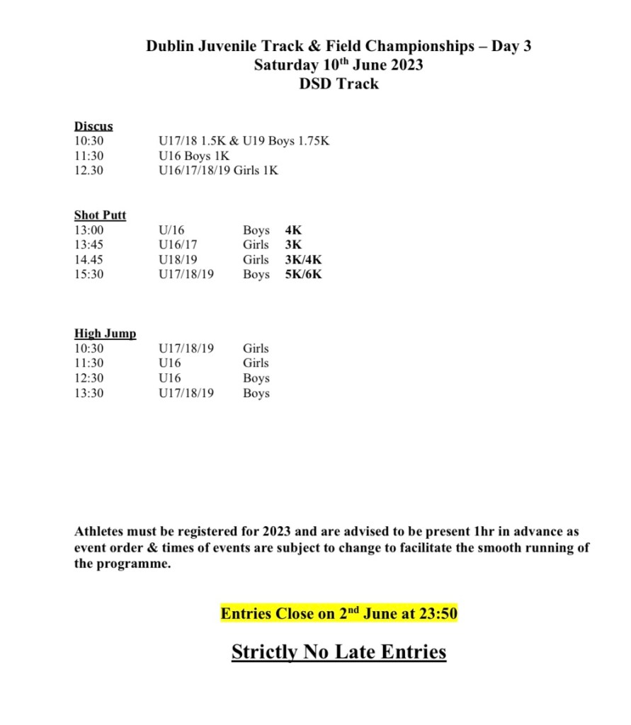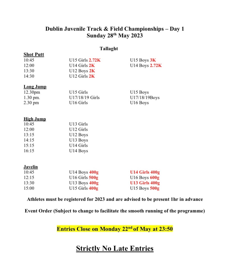 Day 1 – Tallaght – Sunday 28th May – Online entries are open and close on Monday 22nd of May. Enter here : https://entry.athleticsireland.ie/#/