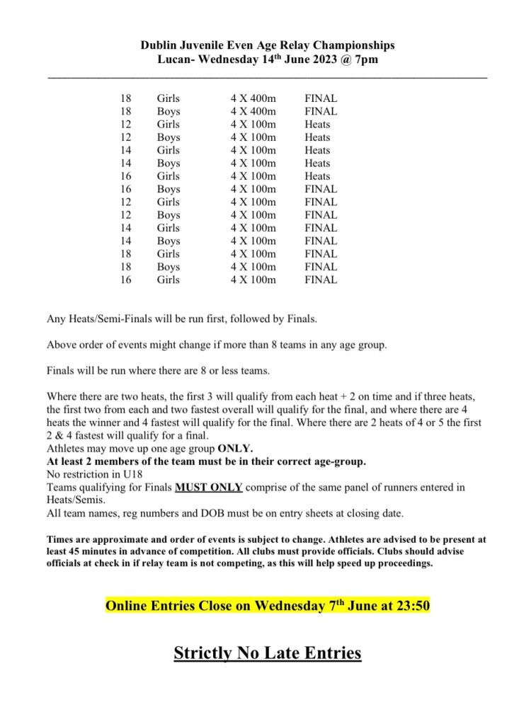 Even Age Relays – Lucan Track – Wednesday the 14th of June