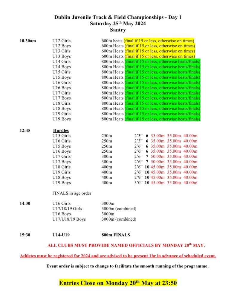 (Scroll down to bottom where you will see “25th May – Dublin Juvenile Track & Field Championships – Day 1” )