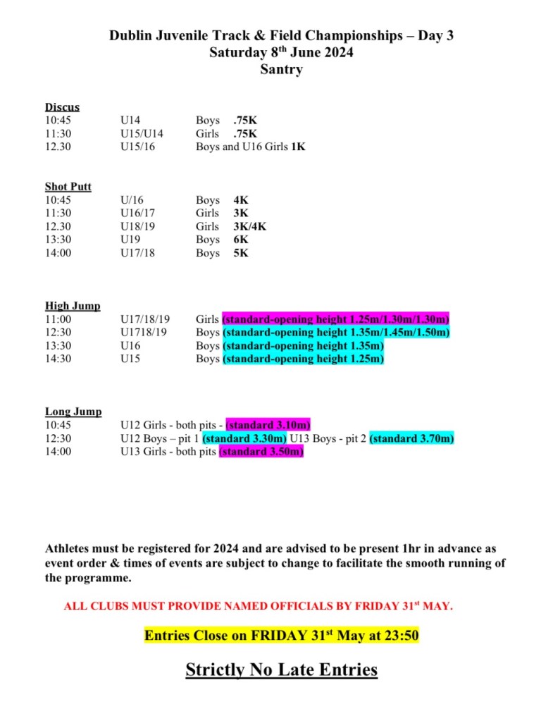 Please find below the links to the online entries and timetables for the Dublin Juvenile T&F Championships.