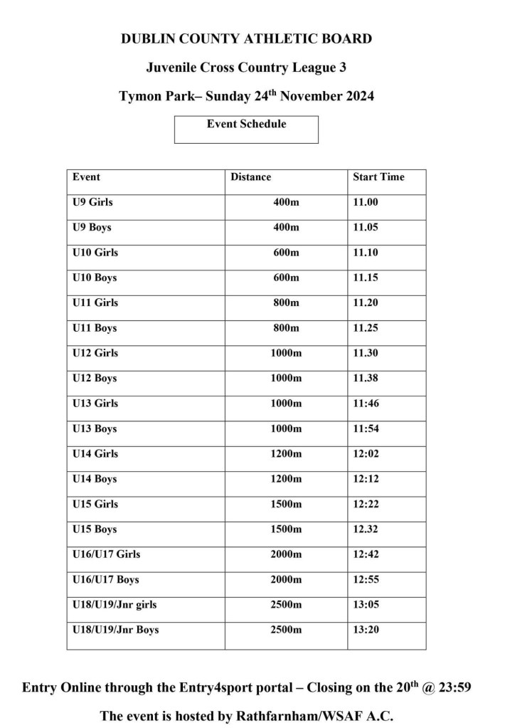 Please see the schedule for League 3 in Tymon Park on Sunday 24th November. Further information will be circulated in due course.