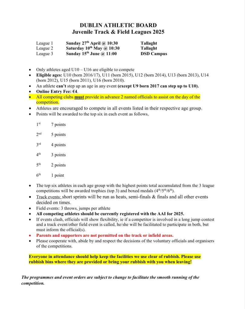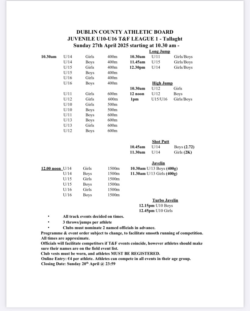 Please find attached details for the juvenile track & field leagues, and the programme of events/timetable for league 1.