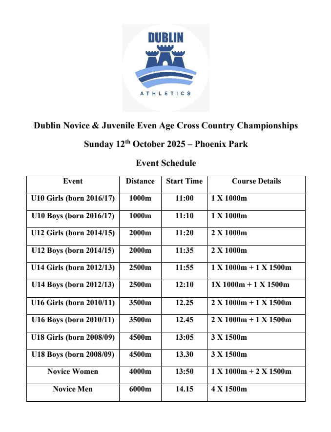 Find attached the schedule of events and course map for the Dublin Novice & Juvenile Cross Country Even Age Championships scheduled for the 12th of October in the Phoenix Park.