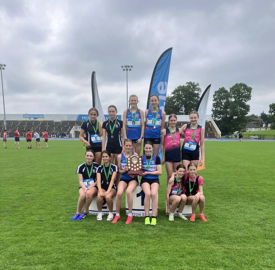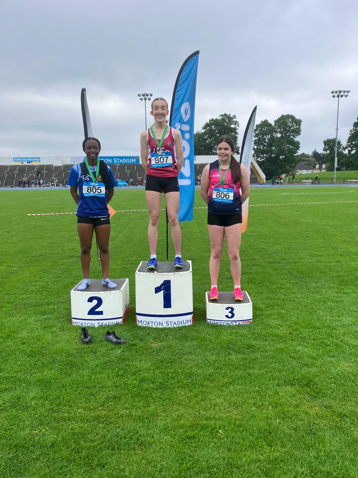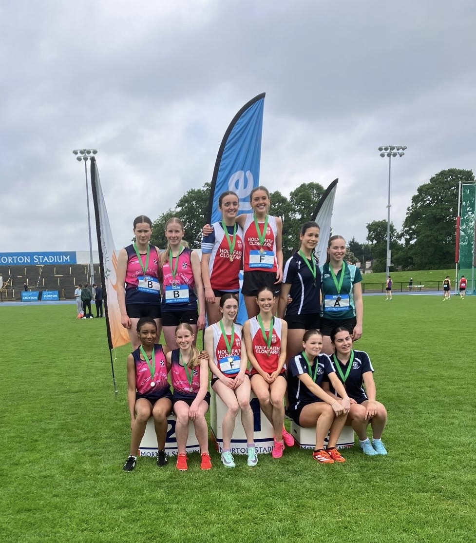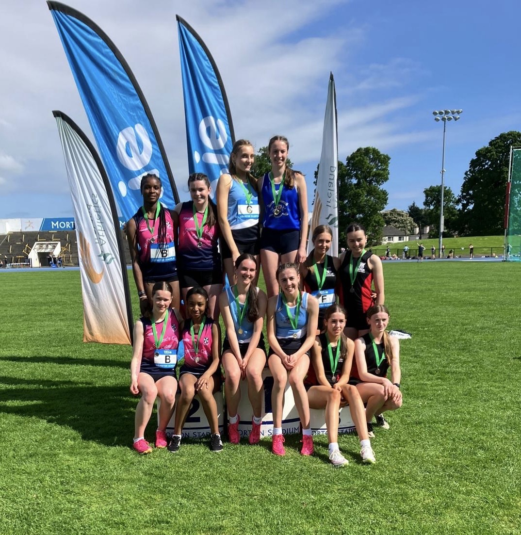 The under 16 relay 4 x 300 team from St Dominic’s fought a great battle with Holy Faith Clontarf and were just a meter or two off the gold medal. Great running from Martha, Danielle, Aoibhinn and Erin.