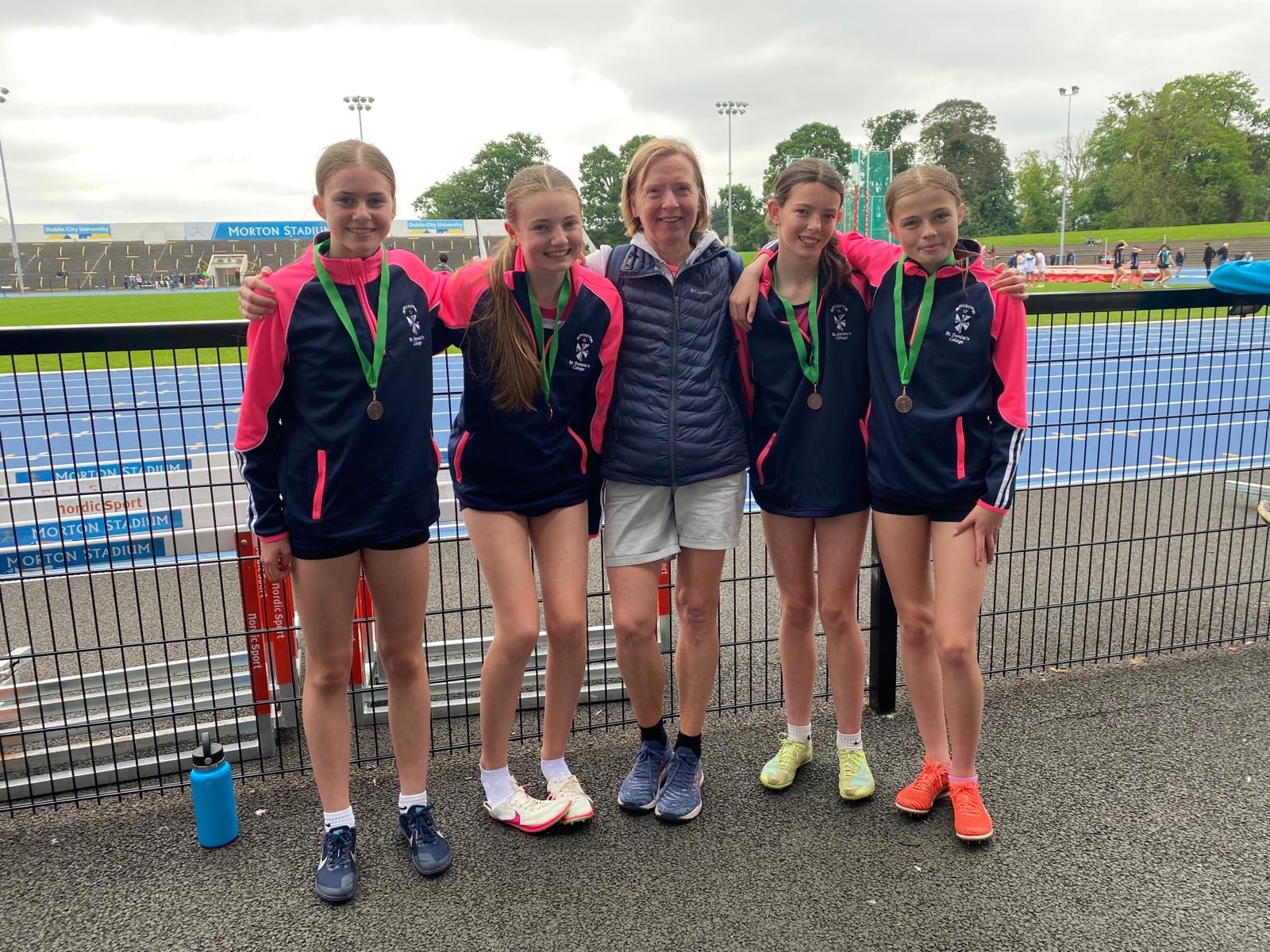 We had a very successful day 2 in Santry today. Aimee Ryan finished 3 rd in her 200 under 16, Jessica and Maggie competed in the minor 500 and 800. Both did their best today but were outside the medals. The minor relay team from St Dominic’s performed well above their station today and pulled off a well deserved 3rd place . Very slick baton changing and total trust in each other , with Maisy leading off into Pearl, Saoirse Rogers on 3rd leg and Jessica fighting all the way down the home straight getting the team from 4th to 3rd. Great running girls!