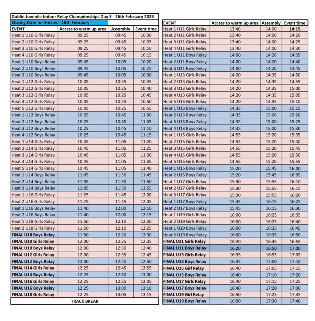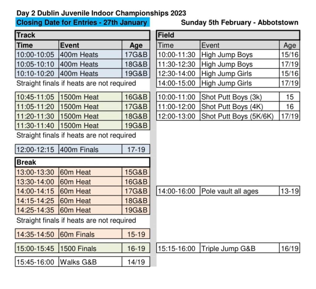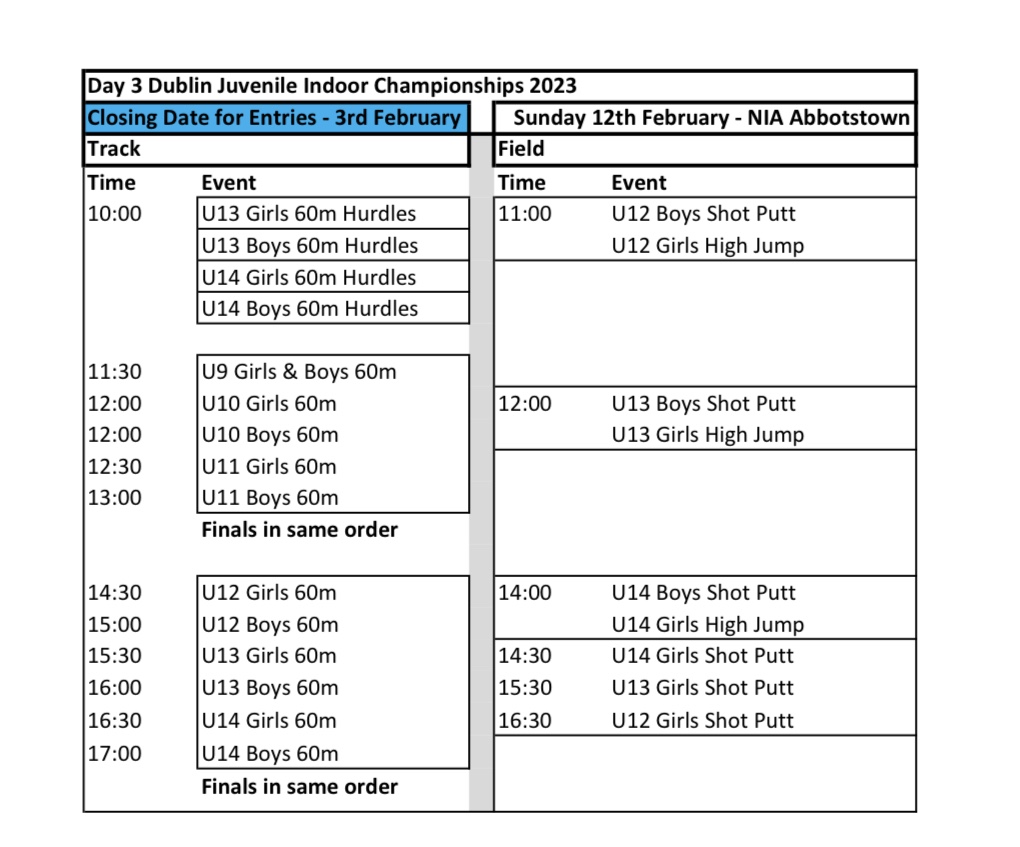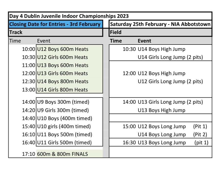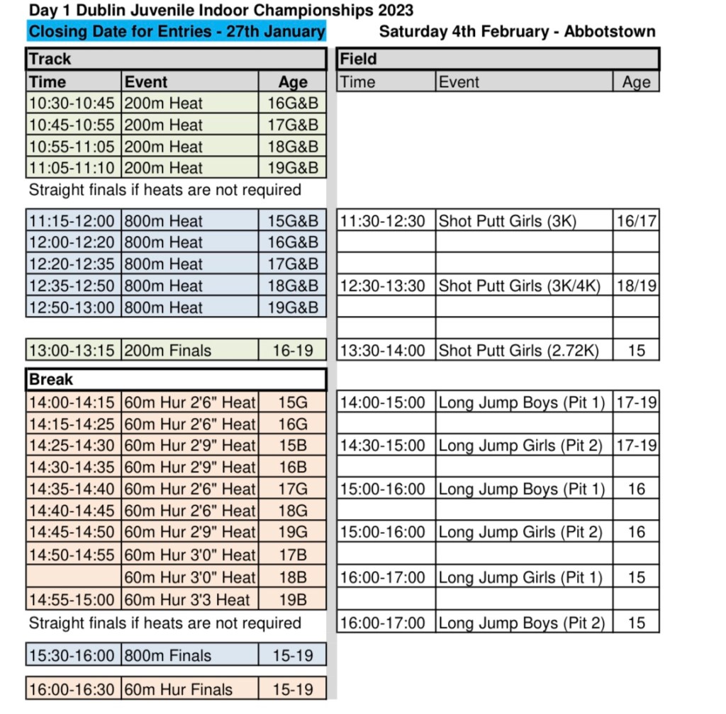Sat 7th Jan Dunboyne track meet at 9.30 sprints group and middle distance athletes born 2008 and older.